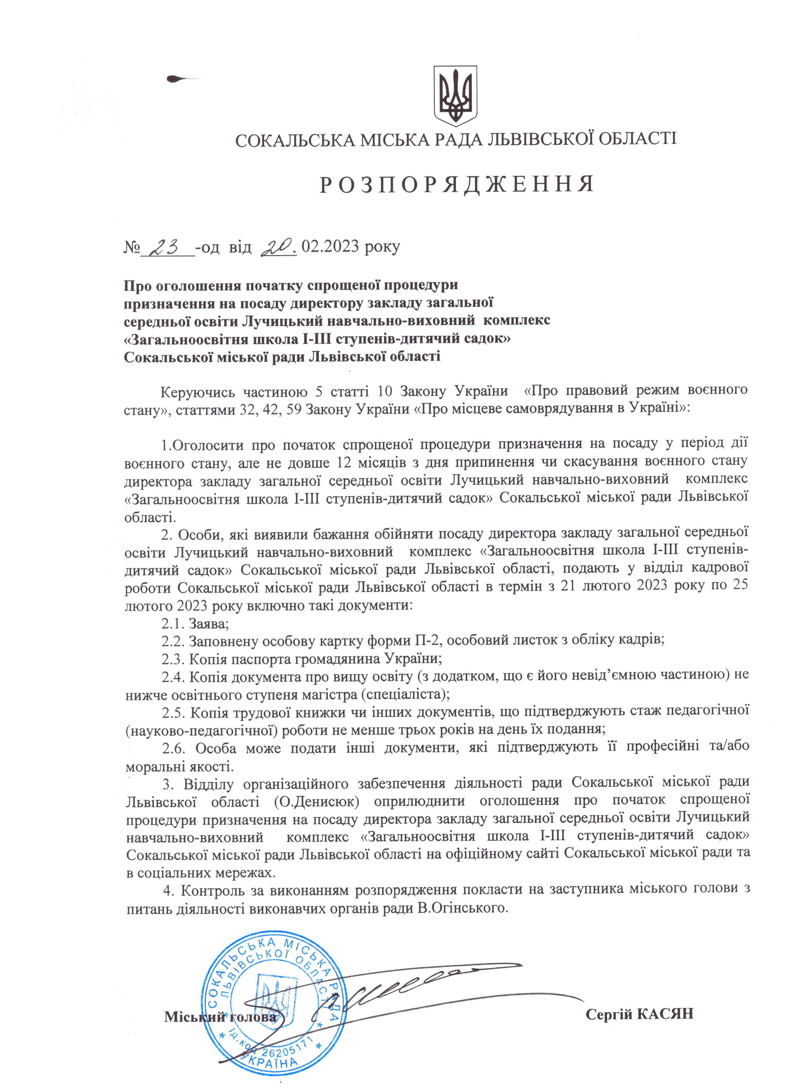 Розпорядження про оголошення спрощеної процедури призначення на посаду директора ЗЗСО Лучицький НВК
