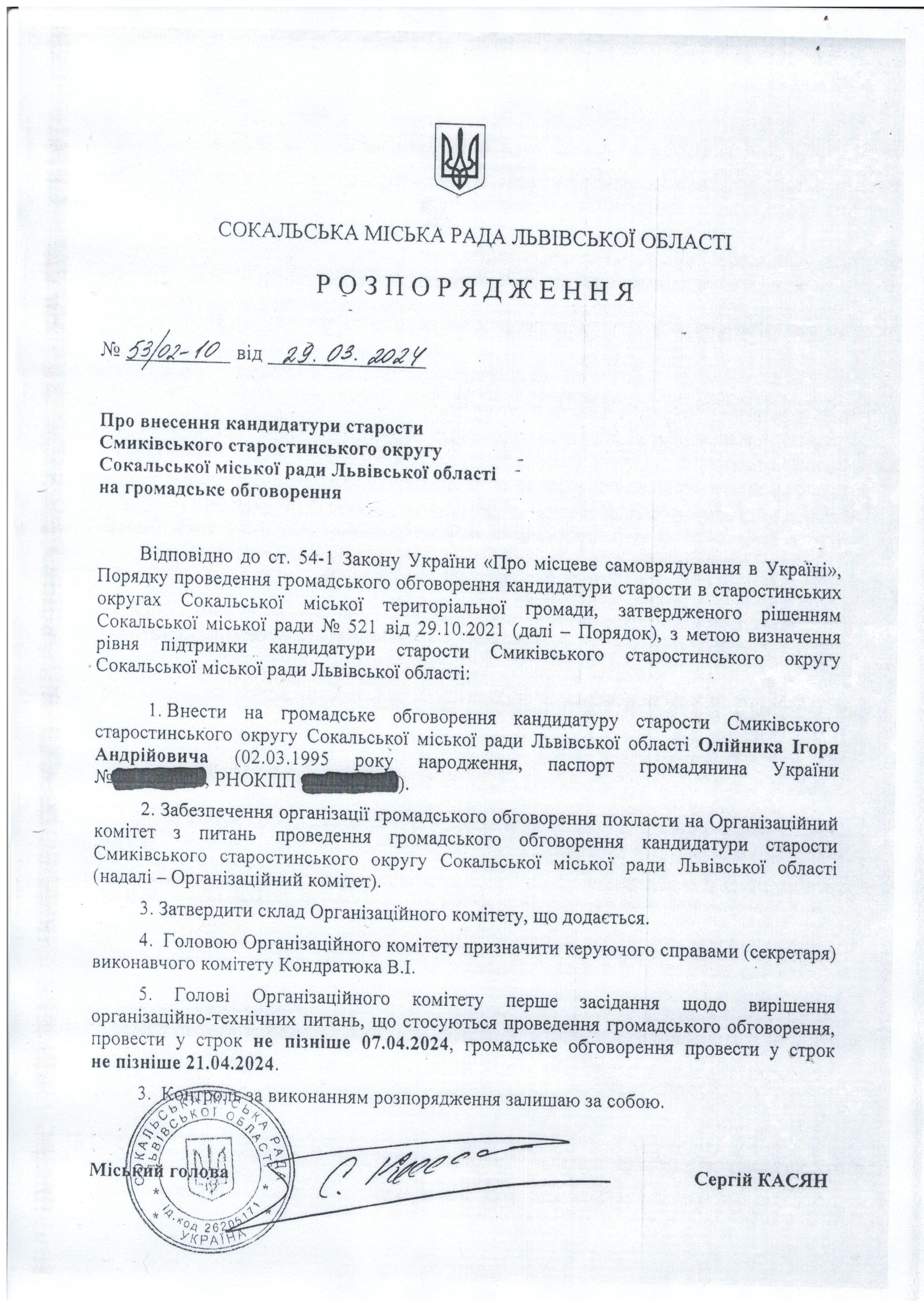 Про внесення кандидатури старости Смиківського старостинського округу Сокальської міської ради Львівської області на громадське обговорення