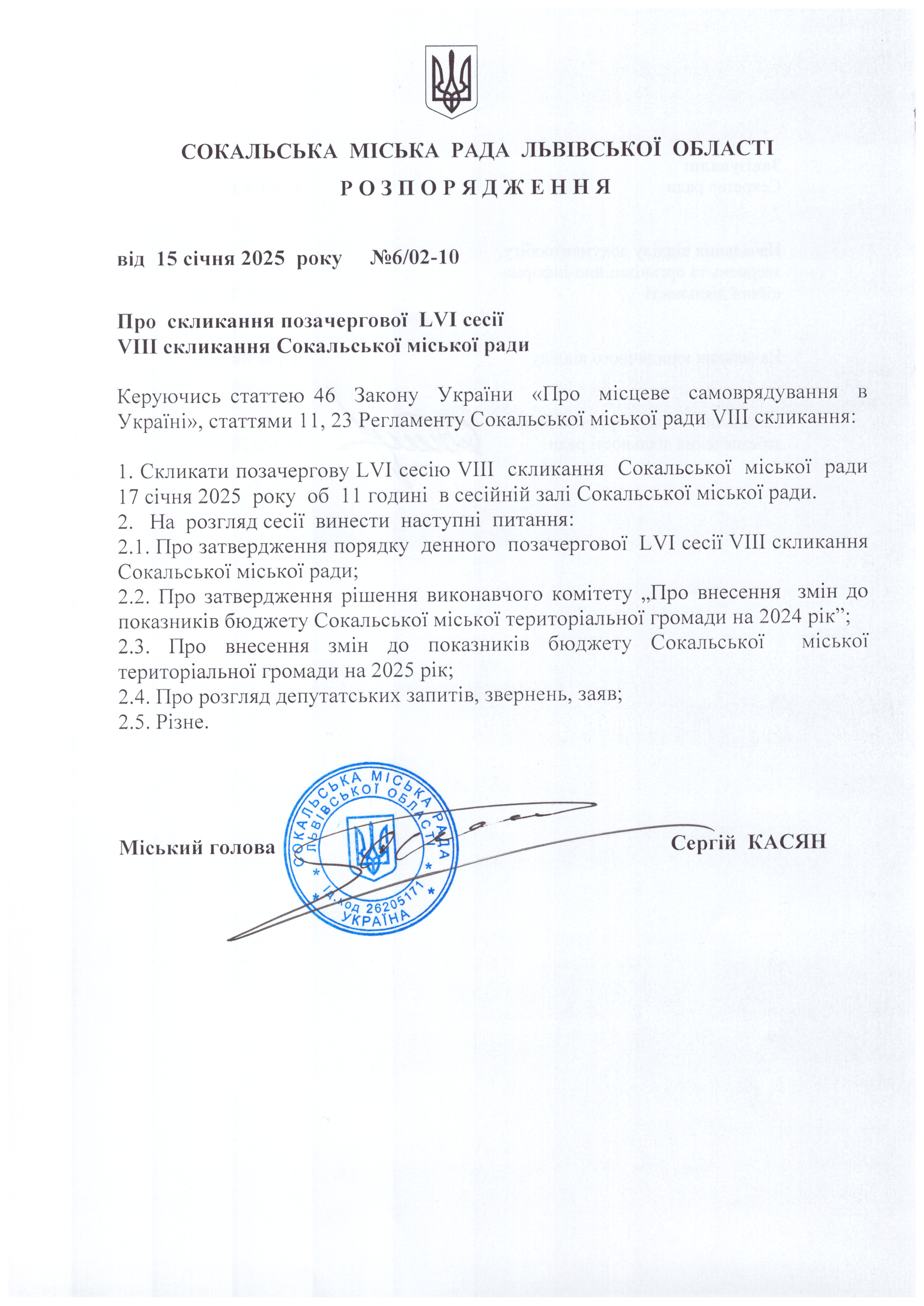 Розпорядження про проведення 56 сесії Сокальської міської ради