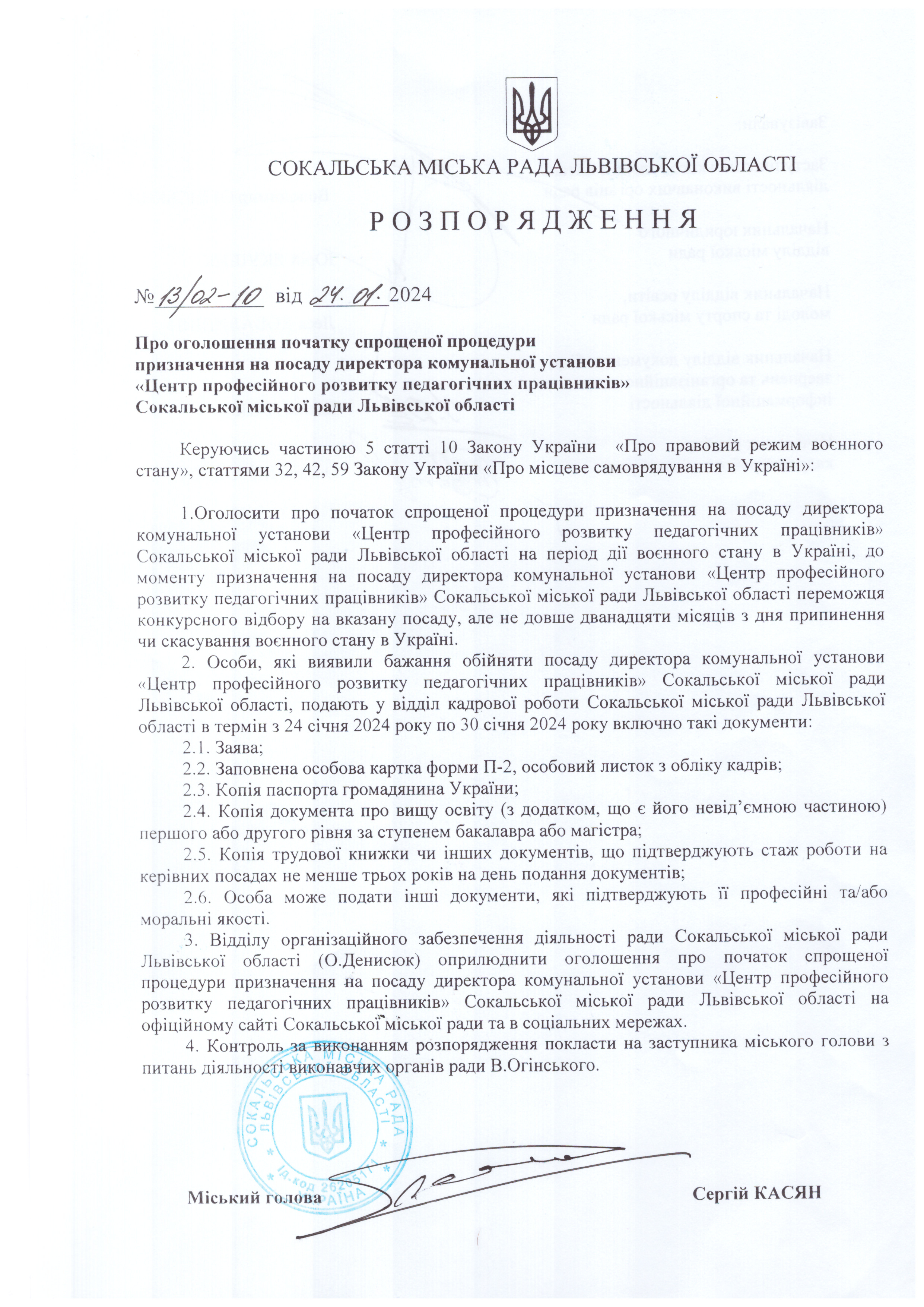 Розпорядження про початок спрощеної процедури призначення на посаду директора КУ