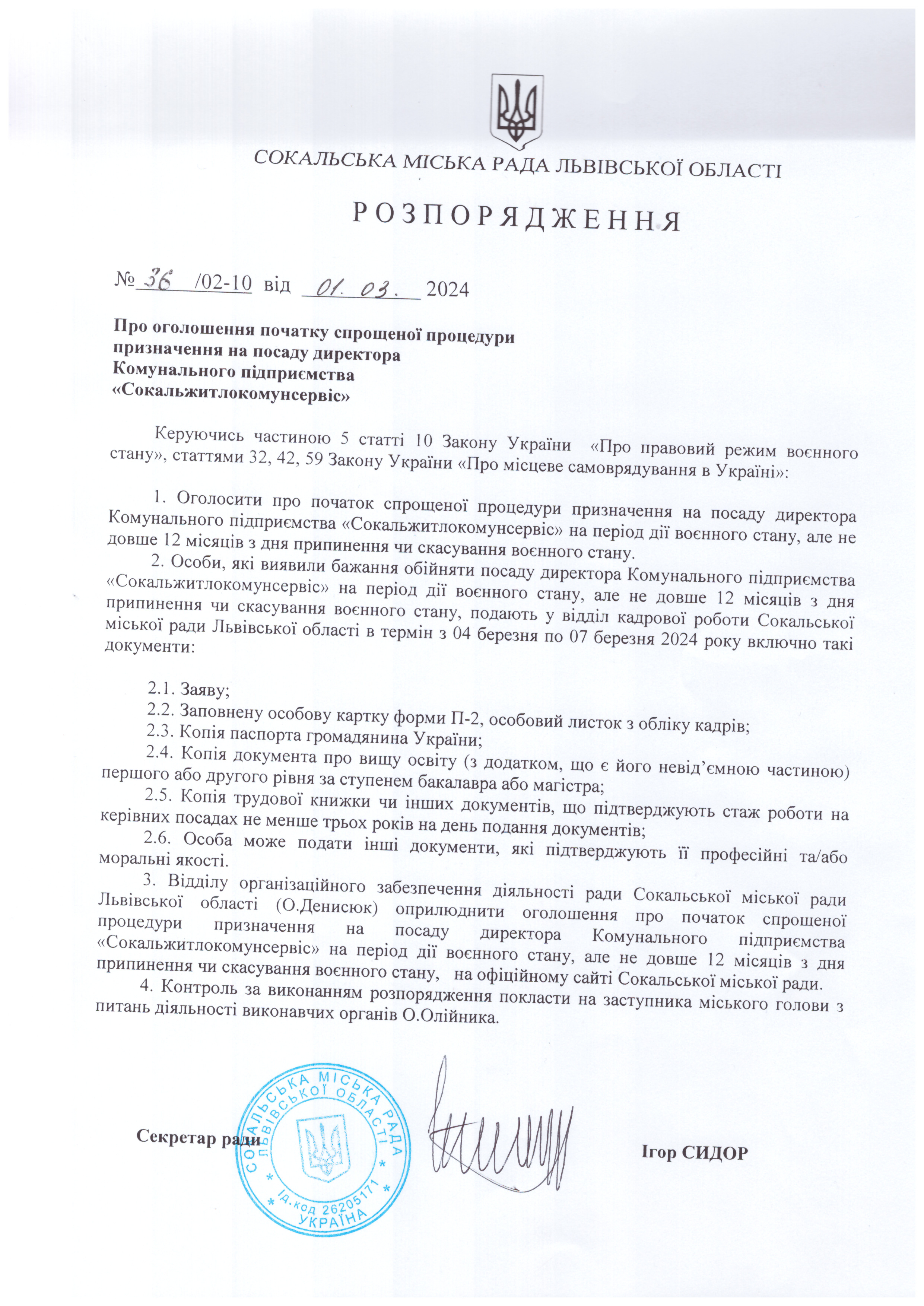 Розпорядження про початок спрощеної процедури призначення на посаду директора комунального підприємства